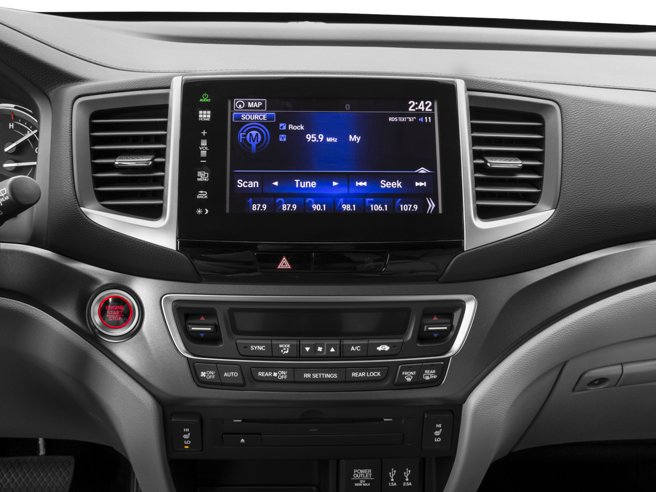 - Radio: AM/FM Audio System -inc: 225-Watt, 7 speakers including subwoofer, Bluetooth® HandsFreeLink, Bluetooth® streaming audio, MP3/auxiliary input jack, MP3/Windows Media Audio (WMA) playback capability, Radio Data System (RDS), Speed-Sensitive Volume Control (SVC), USB audio interface w/1.5-Amp and 2.5-Amp charging ports in front and 2.5-Amp charging port in center console, 8" display audio w/high-resolution WVGA (800x480) electrostatic touch-screen and customizable feature settings, HondaLink Next Generation, SMS text message function, Pandora compatibility and Song By Voice (SBV)